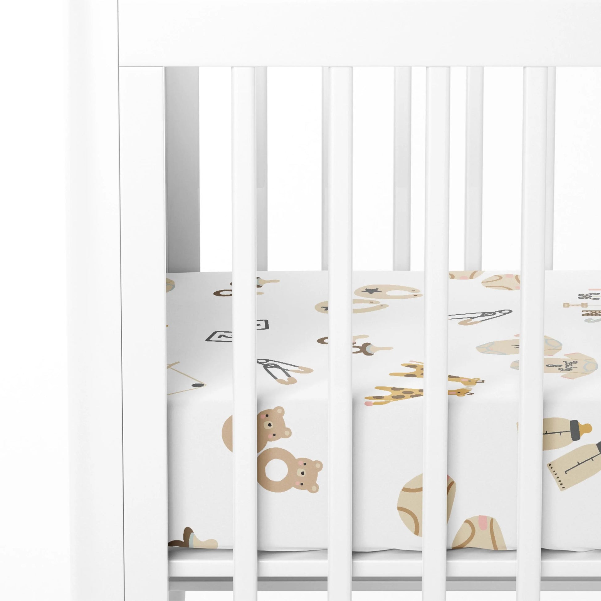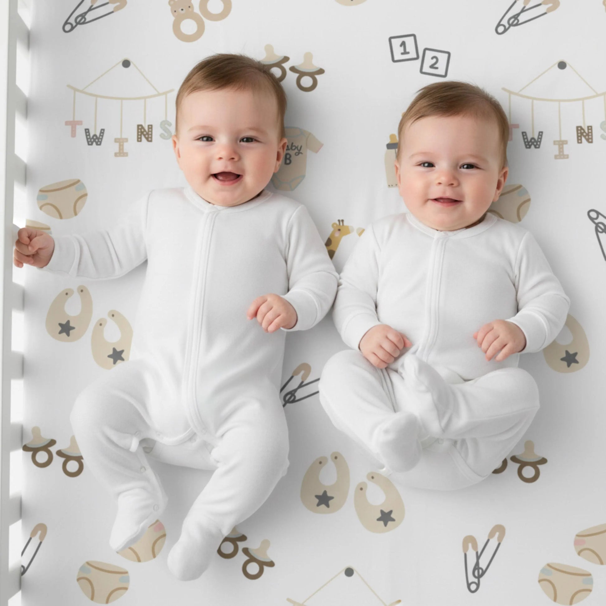 A collection of Twin Things overlay this “two of a kind” fitted crib sheet designed exclusively for twins. Baby A and Baby B onesies, a twins mobile, double pacifiers, giraffes sets, and even double diapers!