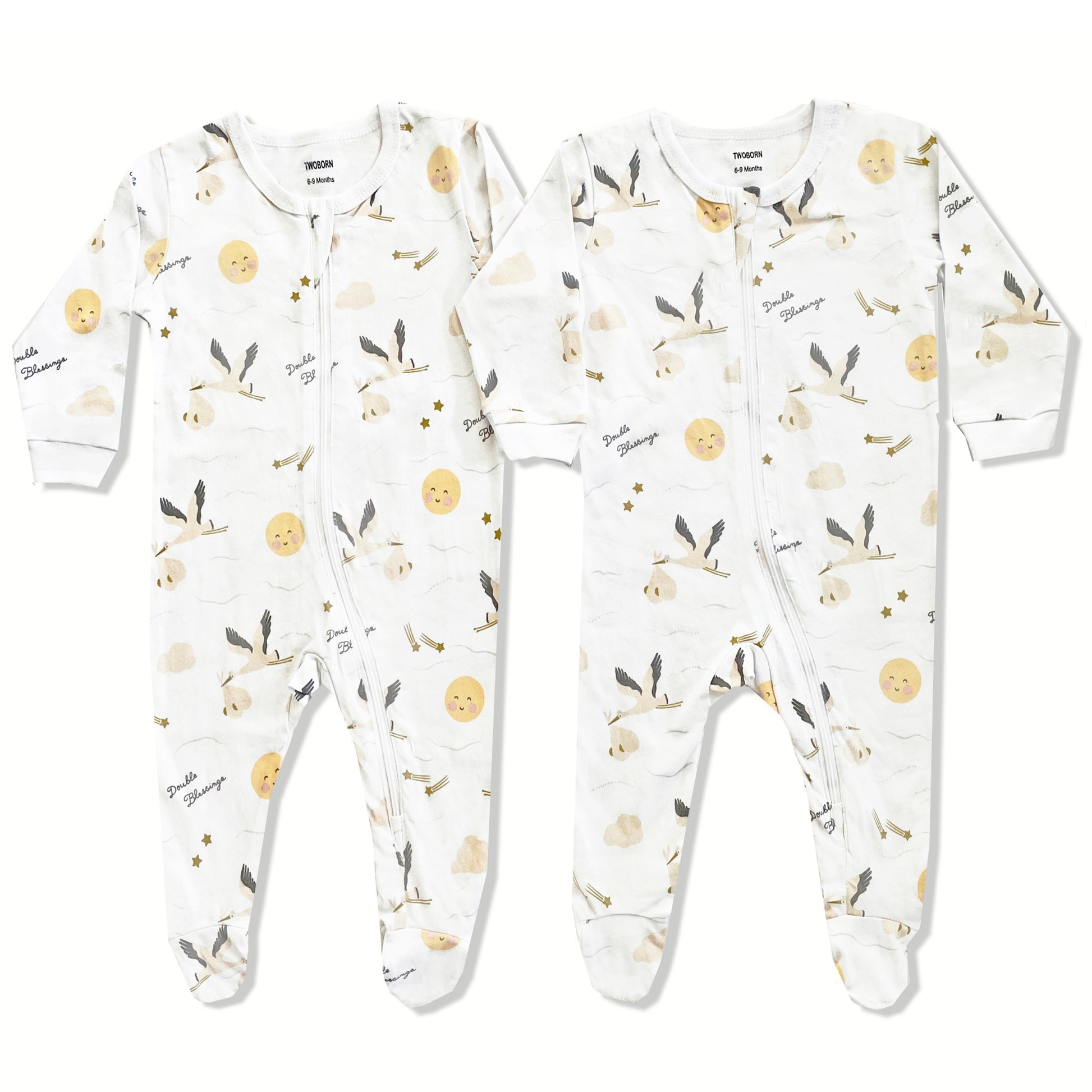 Our Double Blessings footies are doubly adorable and perfect for lounging in any season. The reversible zipper from neckline to feet makes diaper changes a breeze – a huge plus with twins!