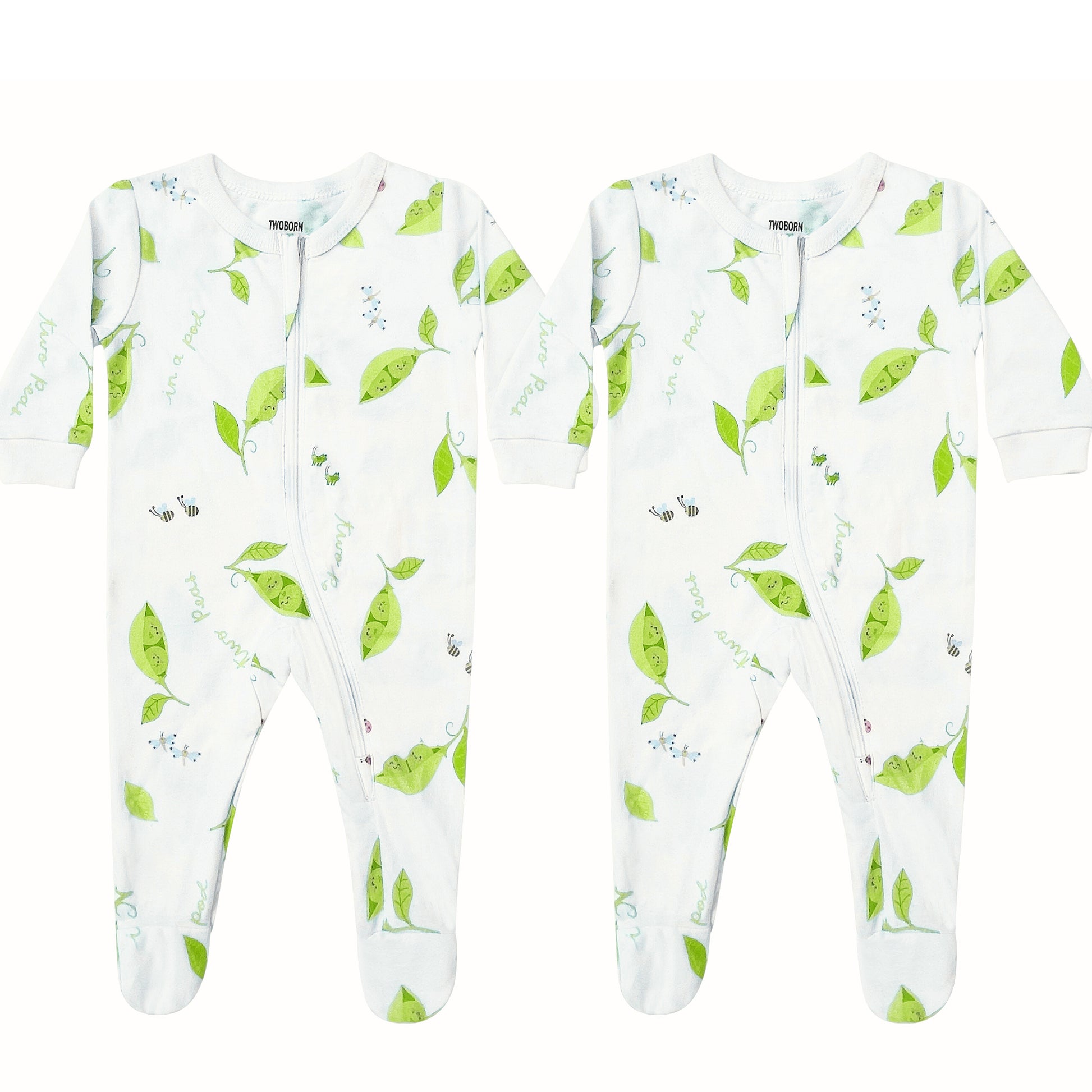Our Two Peas in a Pod footies are doubly adorable and perfect for lounging in any season. The reversible zipper from neckline to feet makes diaper changes a breeze – a huge plus with twins!